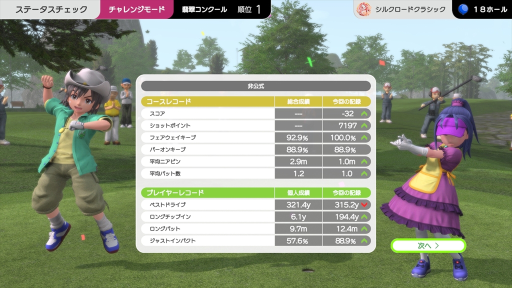 さすがに小学生の少女と筋骨隆々のアメリカンおじさんの最大飛距離が同じなのは若干の違和感を感じるけど、好きなキャラでどんなコースでも攻略できる、ってメリットもあるから、ざるたんは肯定的。