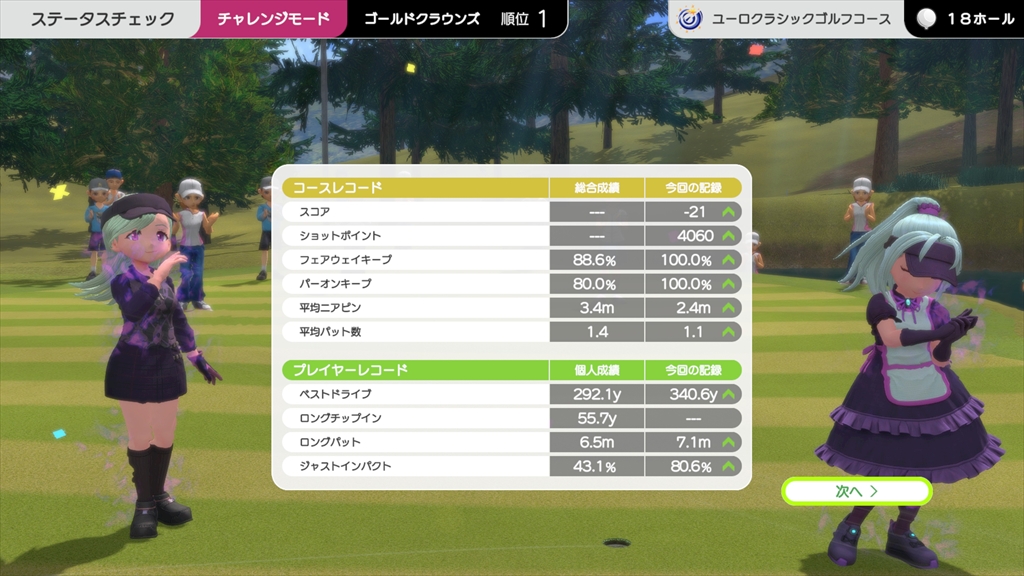距離さえ出てればレギュラーティーからのプレイでは恐ろしいスコアが記録できるようになるんだ。例えば上の画像は中盤位に解放されるユーロクラシックゴルフコースでのスコアなんだけど、18ホールのスコアが驚愕の『-21』ってなってる。飛距離の暴力。