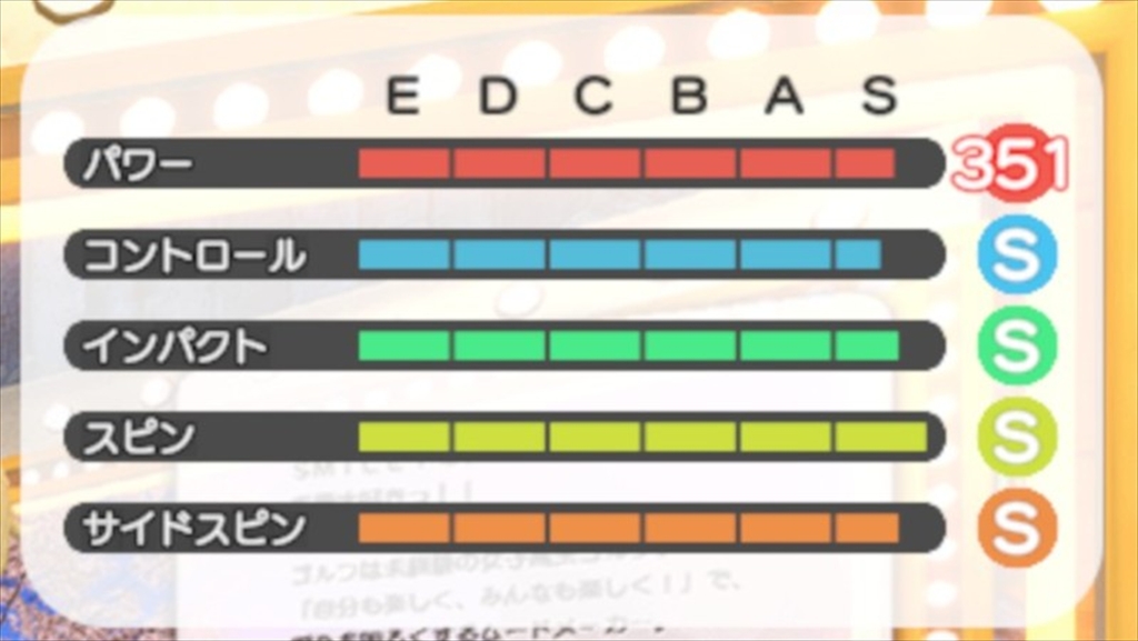 みんゴルワールドのパワーの値はそのままドライバーの飛距離になるんだ。351ヤードが平均的な飛距離、ってことになってるんだけど、あり得ない位の値なんだよね。アメリカツアー男子のトップクラスの飛ばし屋でも平均で320ヤード、いやそれでも十分にやばいけど。