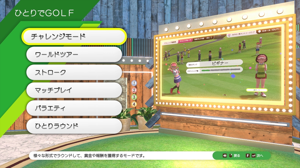 ひとりでGOLFの中にもいくつかモードがあって、好きなキャラクターを使ってランクを上げたり、使用可能キャラクターを増やしたり、新しいクラブとかボールとかを手に入れたり、ってことが出来る『チャレンジモード』がメインコンテンツ。