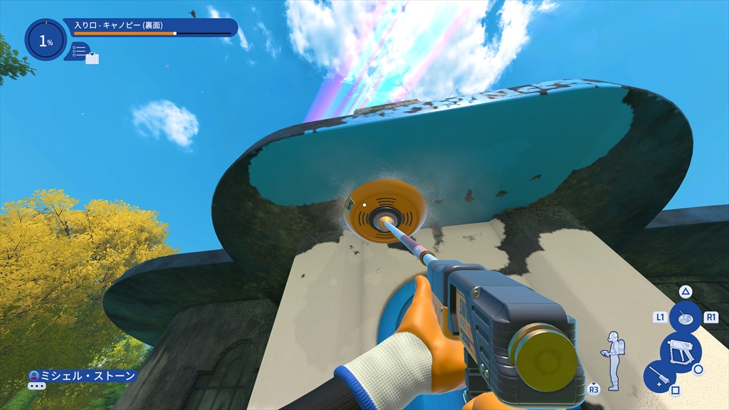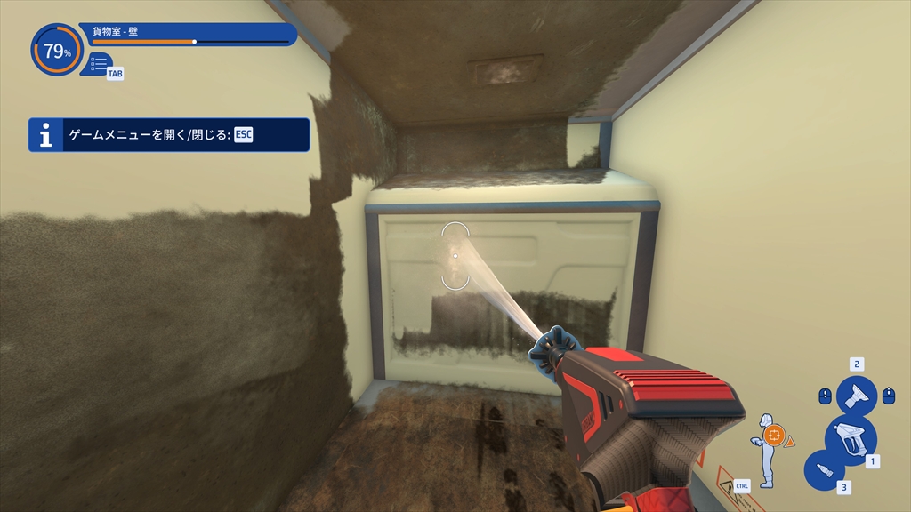 前作でもオブジェクトリストから、個々のオブジェクトの洗浄度合いを表示出来て、そこから目的のオブジェクトをハイライト出来たりしたんだけど、今作ではステージ終盤、多分全体達成度が95%を超えたあたりから、近くの未洗浄オブジェクトを自動でハイライトしてくれるようになったんだ。