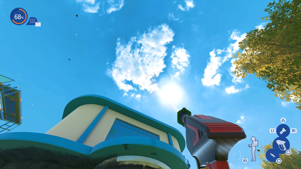 汚れてる状態の建物とかは前作に引き続きダークマターに包まれてるから画質なんてよくわからないんだけど、空の描写とかガラス面・水面への反射の描写とか、光線の感じとかあらゆる部分の画質がグレードアップしてるんだ。