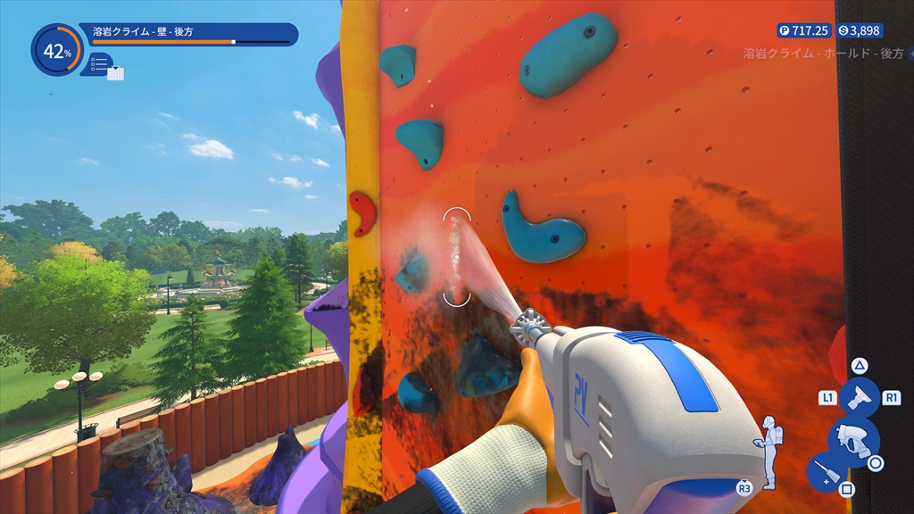 高所にある看板とかのオブジェクト相手に、正攻法では足場を使ってちょっと離れたところから水をかける、って感じになるんだけど、足場を使って看板自身に上って上から見下ろしながら水をかける、ってやった方が効率的。